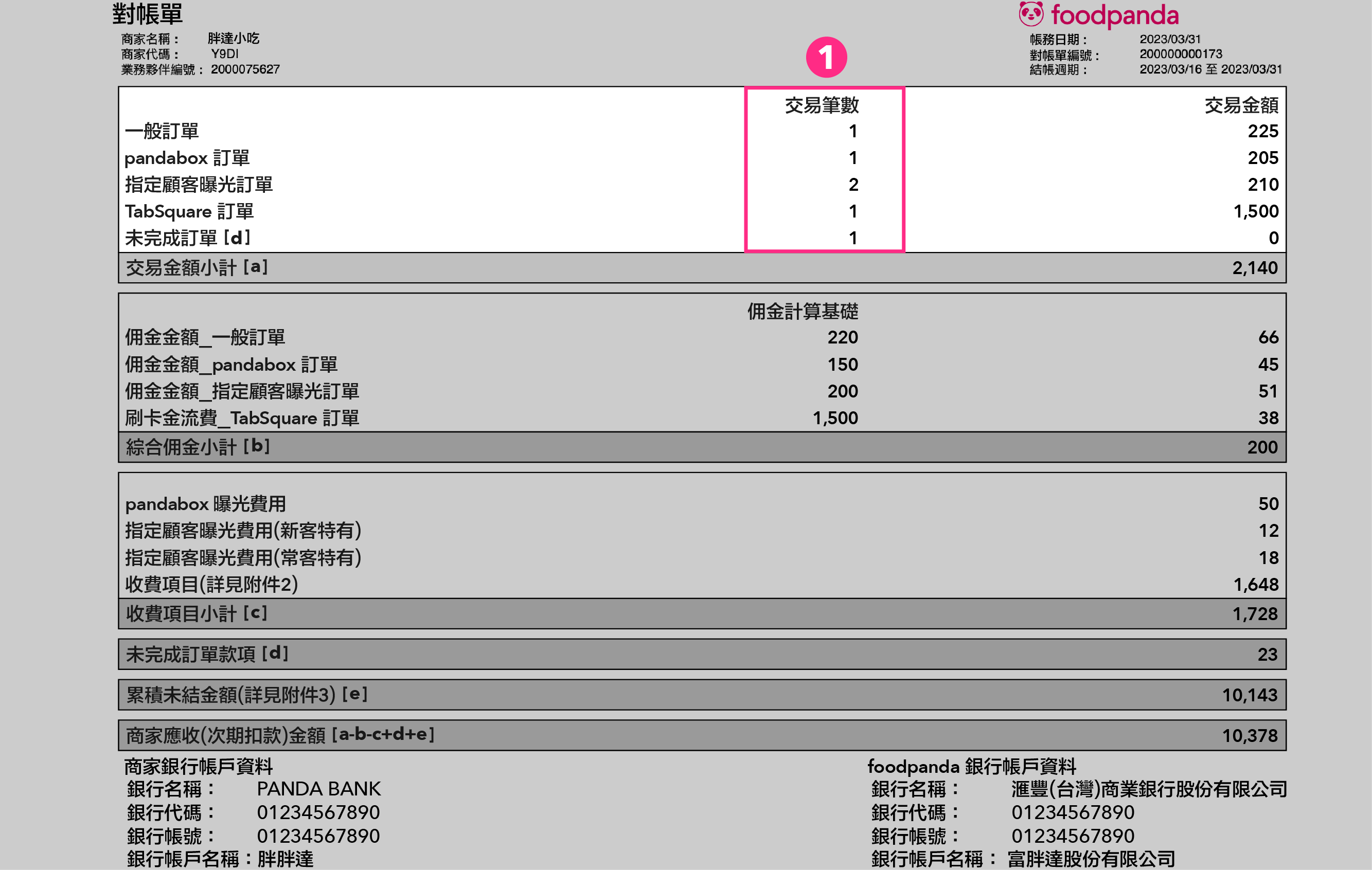 表示為此結帳週期的各類訂單總數,分別為: 一般訂單、pandabox 訂單、指定顧客曝光訂單、TabSquare 訂單、未完成訂單的各類訂單數總。