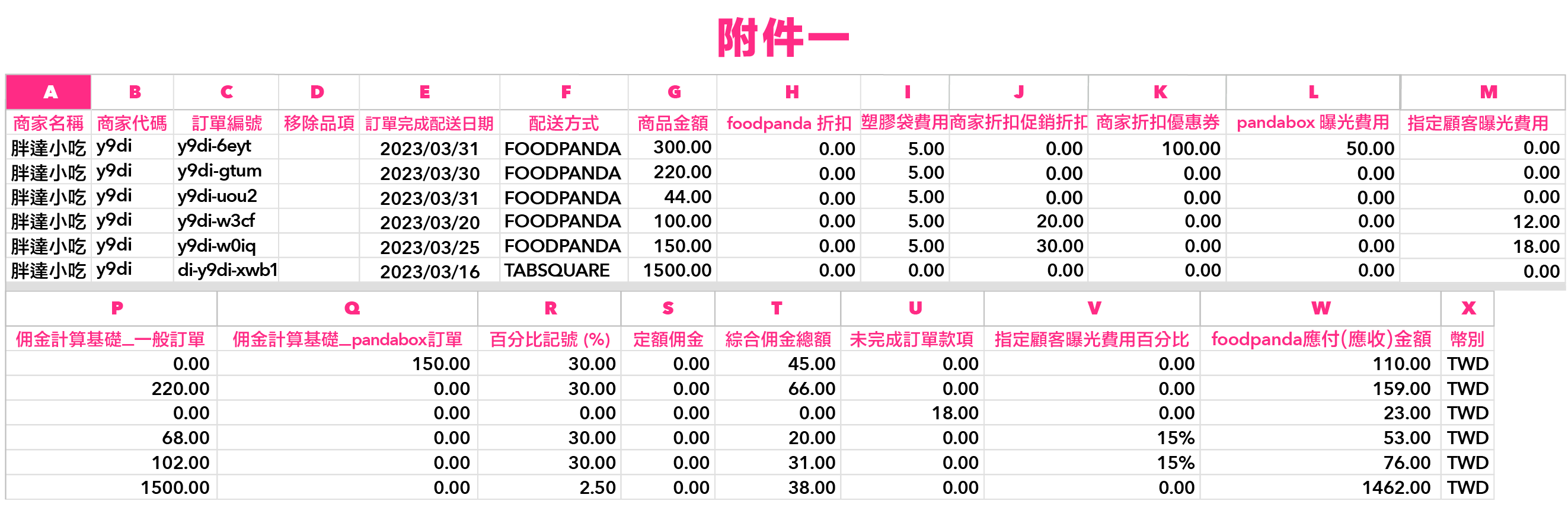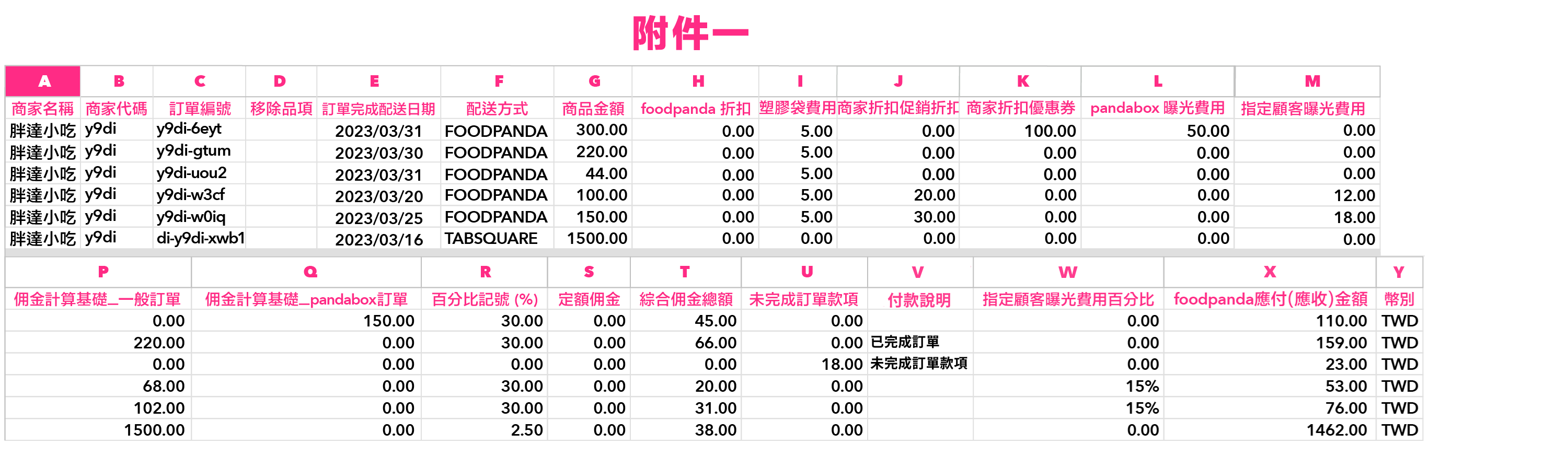 佣金計算基礎一般訂單(P 欄)- 綜合佣金總額(T欄)=foodpanda 應付金額(W欄)