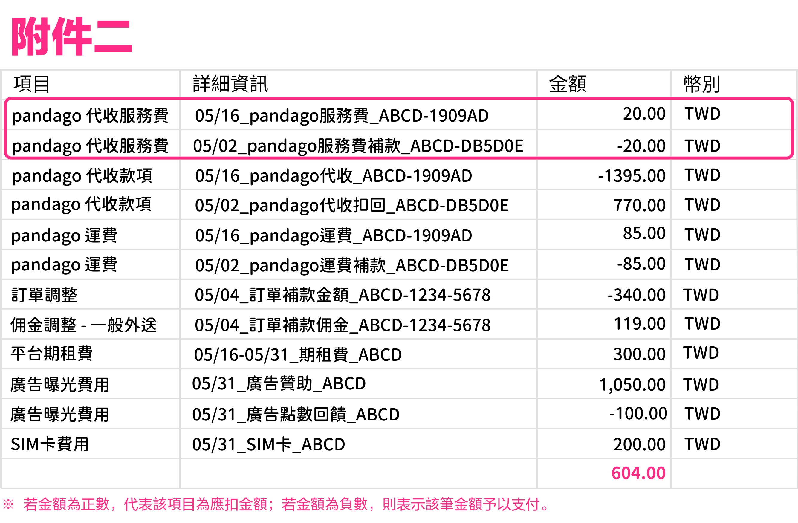 為 pandago 訂單【ABCD-1909AD】之代收款項項目