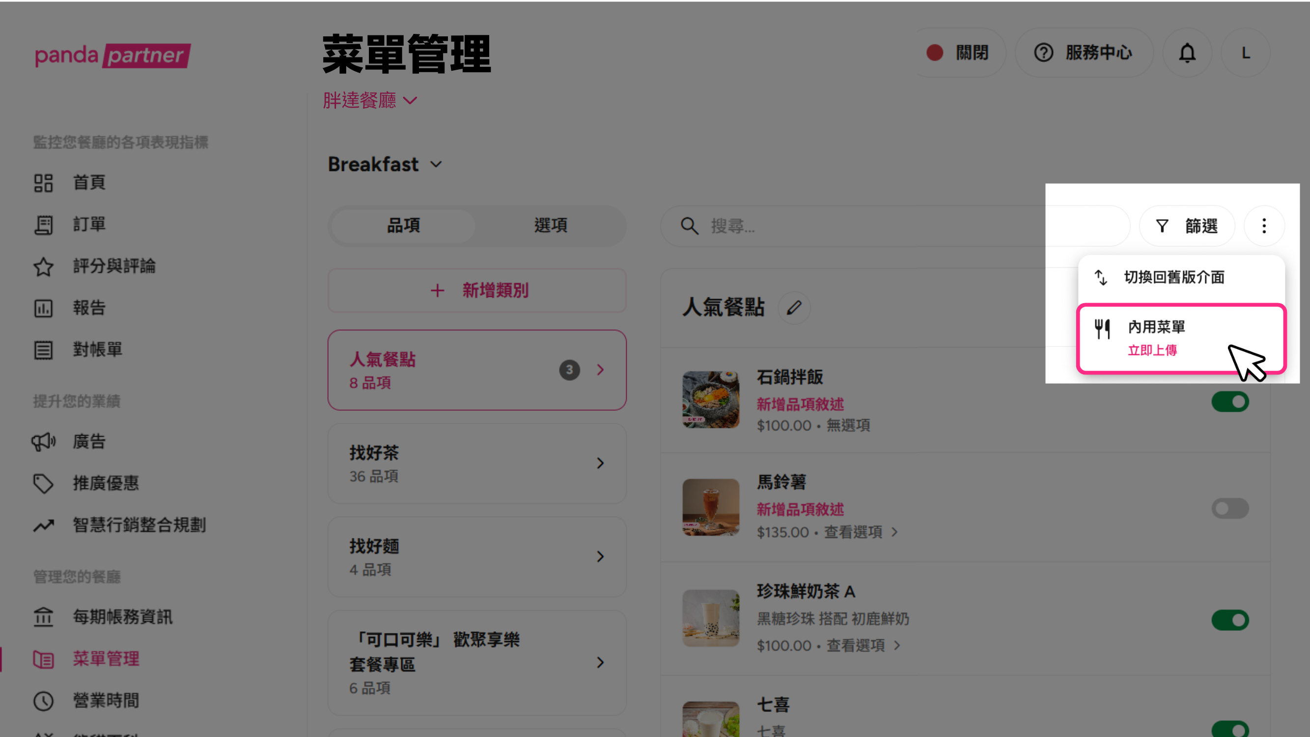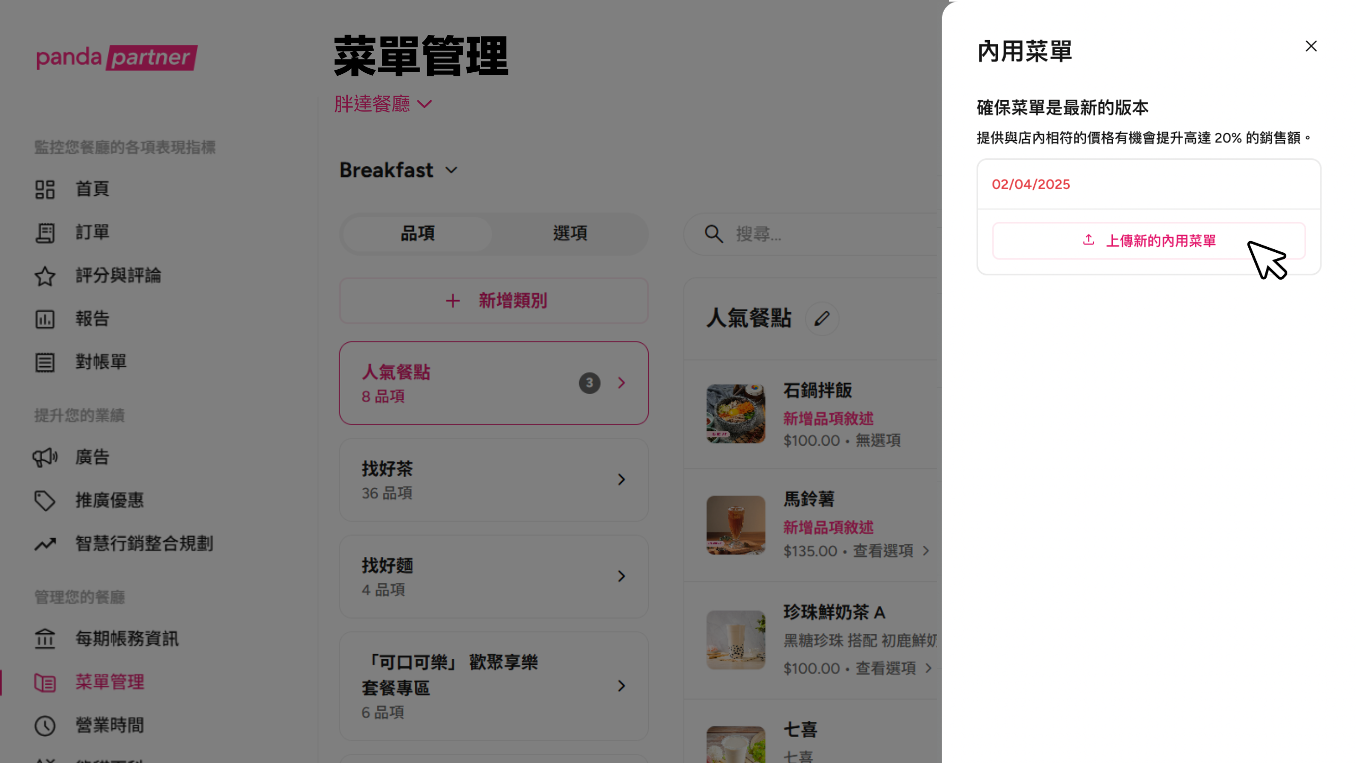 若商家夥伴有修改 foodpanda 平臺菜單品項之需求,完成其品項的更新後,務必上傳【店內最新點餐菜單翻拍照】,菜單修改申請才算成功。