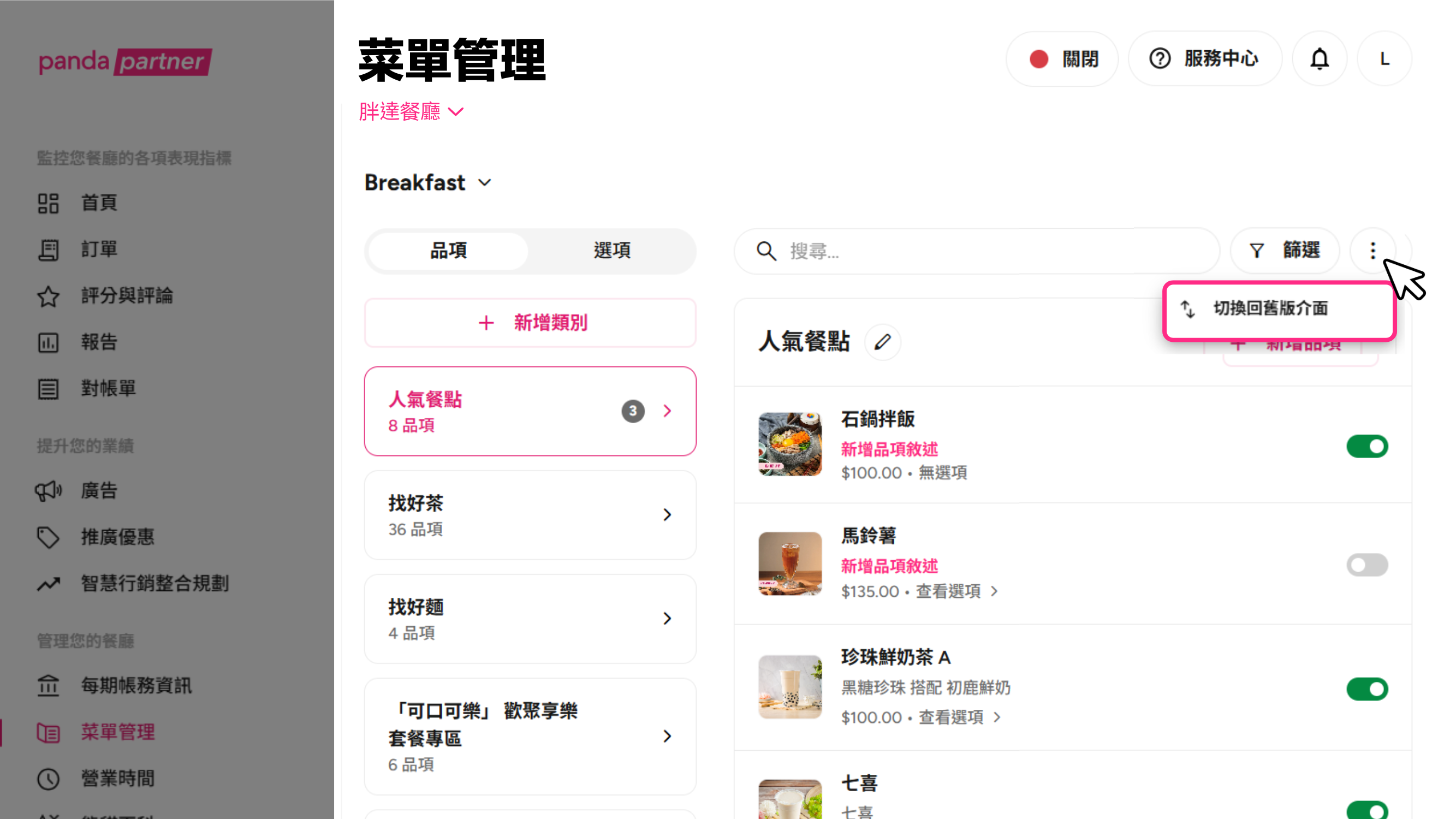 foodpanda 商家平臺【菜單管理】您可依照商家需求建立或調整菜單資訊、客製化類別,調整菜單資訊。凡新增 / 編輯品項、品項變化以及客製化選項價格,須上傳 / 選擇店內最新點餐菜單翻拍照片以供審核。