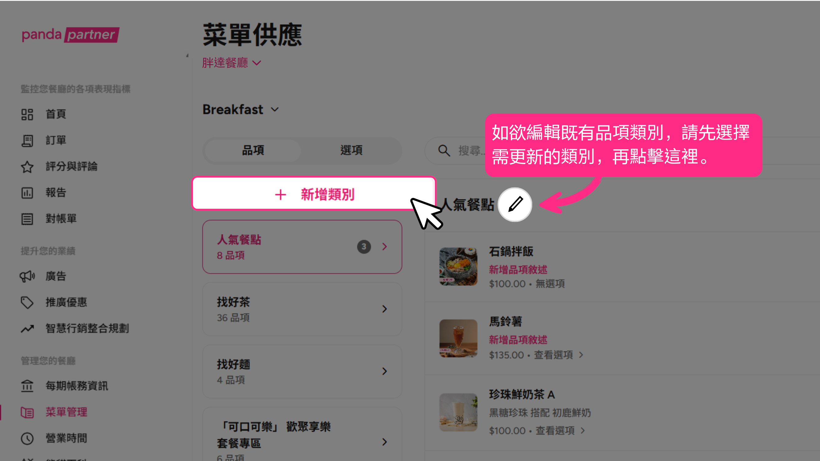 ※ 如欲編輯既有品項類別,點選既有品項類別右側的「鉛筆圖示」