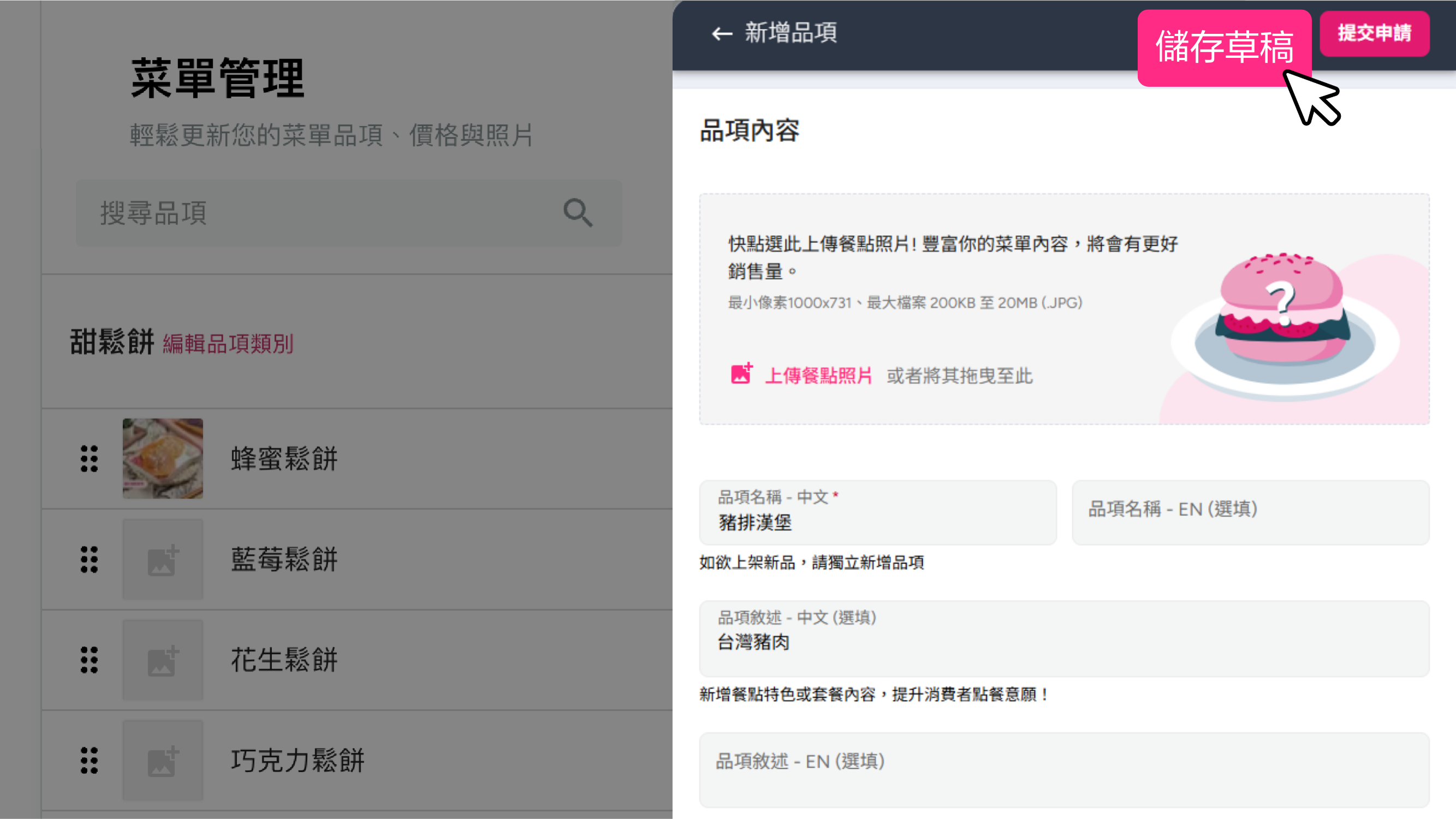 您可以透過【草稿功能】將待上架的餐點、菜單資訊先在商家平臺完成設定,後續在預期的時間再安排上線。