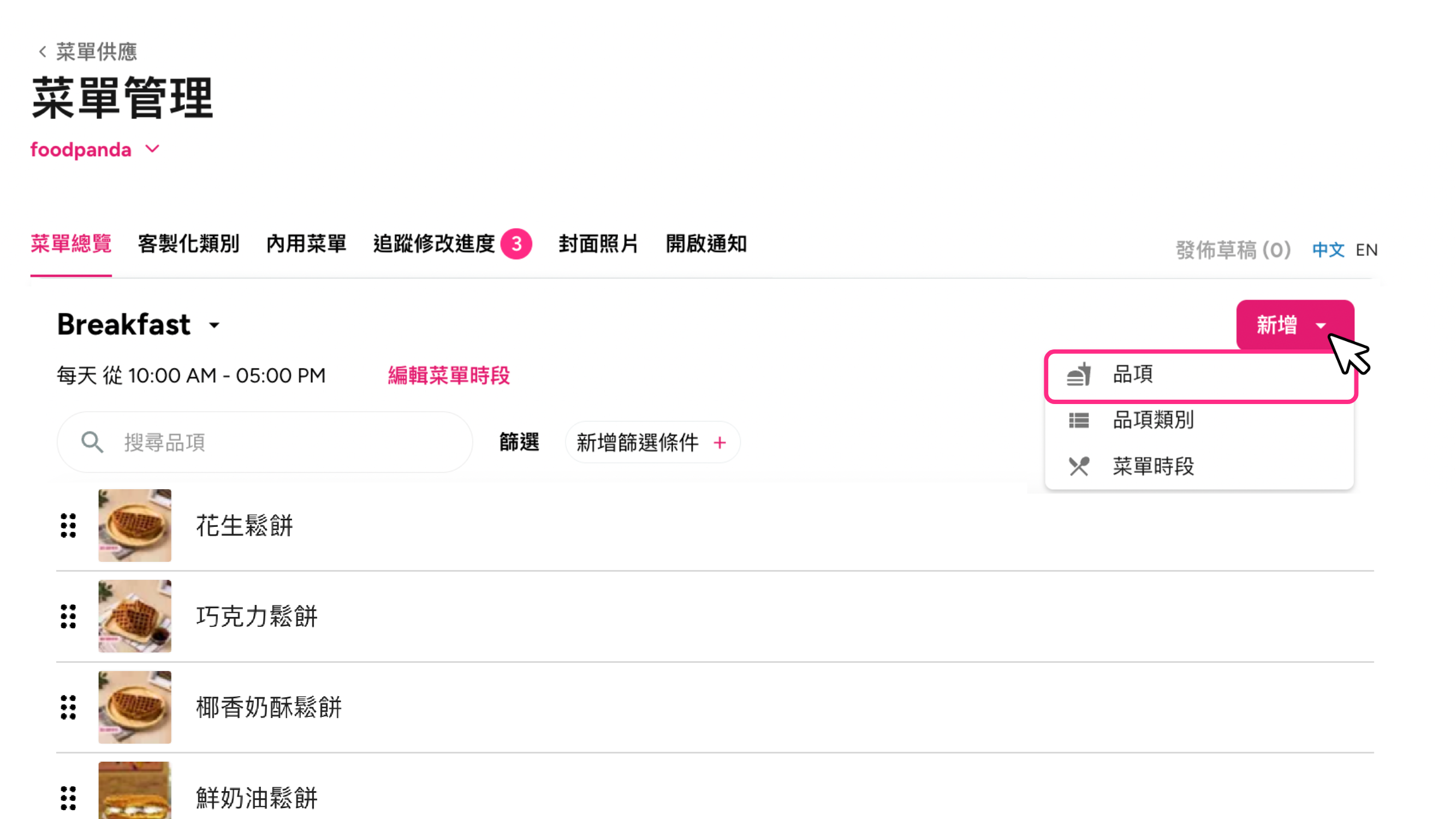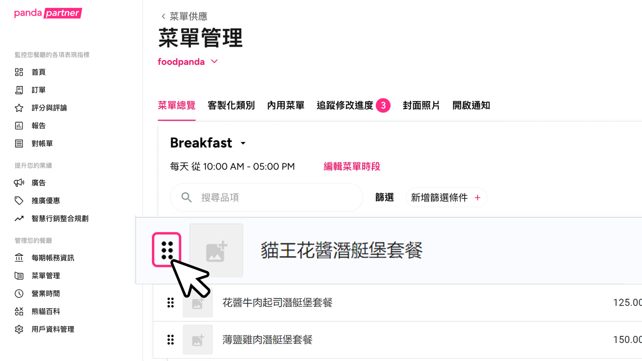 商家夥伴可透過 foodpanda 商家平臺【菜單管理】提出修改申請,請參考 foodpanda 菜單管理教學。